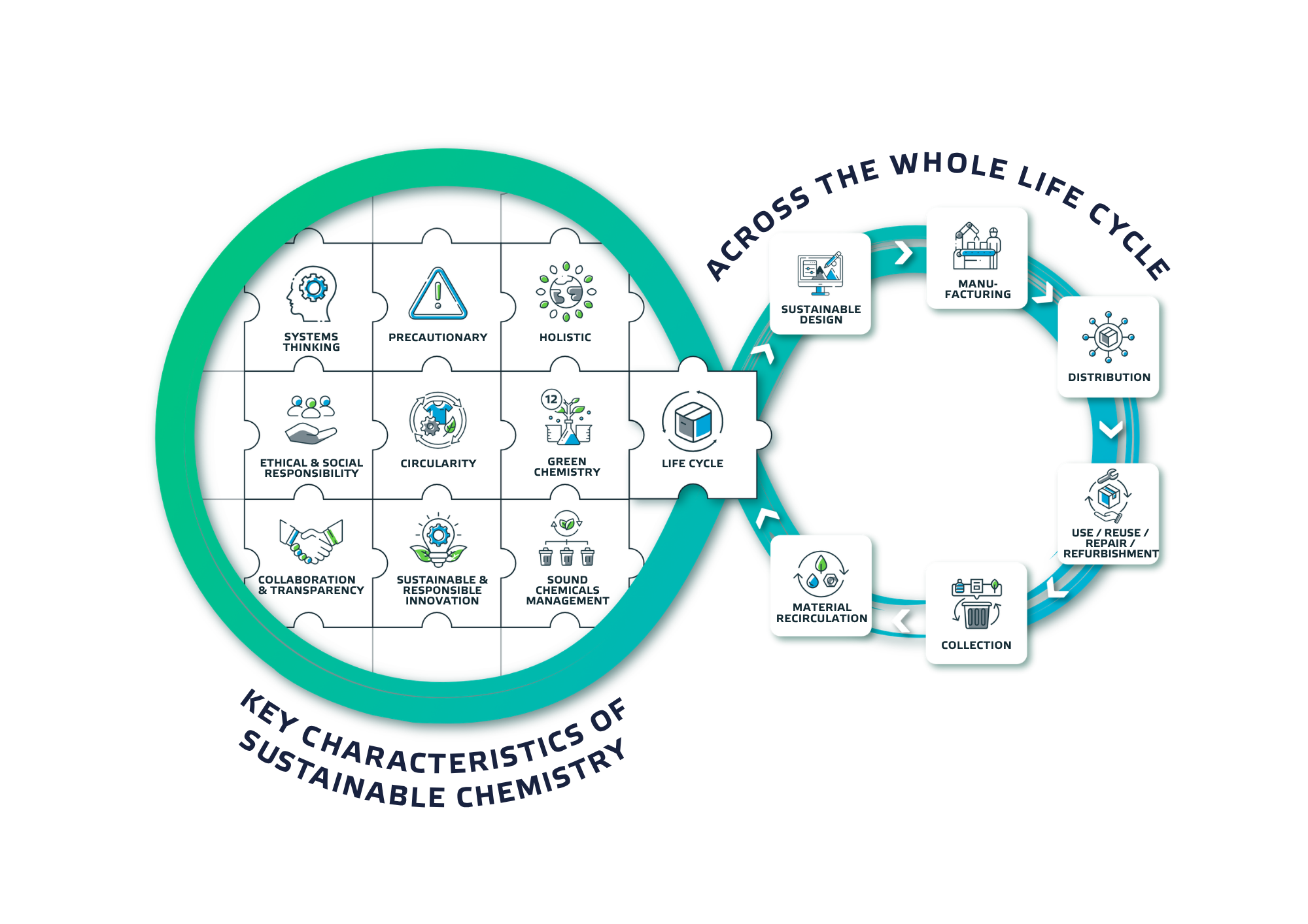 Sustainable Chemistry goes beyond the full life cycle of products (development, manufacturing, use, repair, reuse and recycling), by including system thinking throughout (e.g. replace specific chemical function by service, new design or both). This ensures that processes contribute not only to an increase in economic efficiency but also to a reduction of negative impacts on the environment and human health, while at the same time improving social responsibility through sustainable development and innovation.